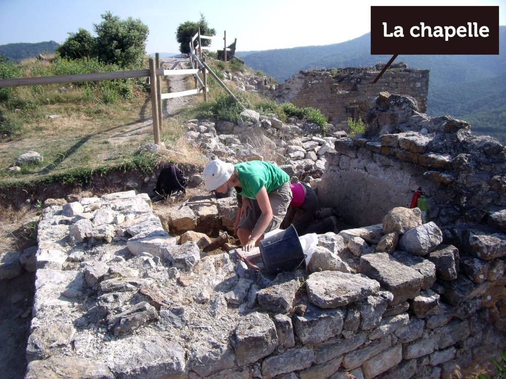 Fouille du "flanquement" en 2007, prise de vue en direction du sud. Remarquez au fond, l'amas de destruction du donjon, dépassant, à l'époque, la chapelle !