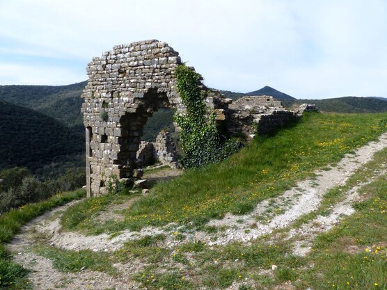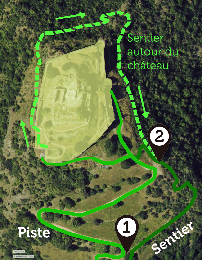 Remontez légèrement, pour sortir par le nouveau sentier "autour du château". Environ 15 minutes pour rallier l'entrée (point 2) par en-dessous des murs. Avec diverses vues et des panoramas sur le monument et les gorges.