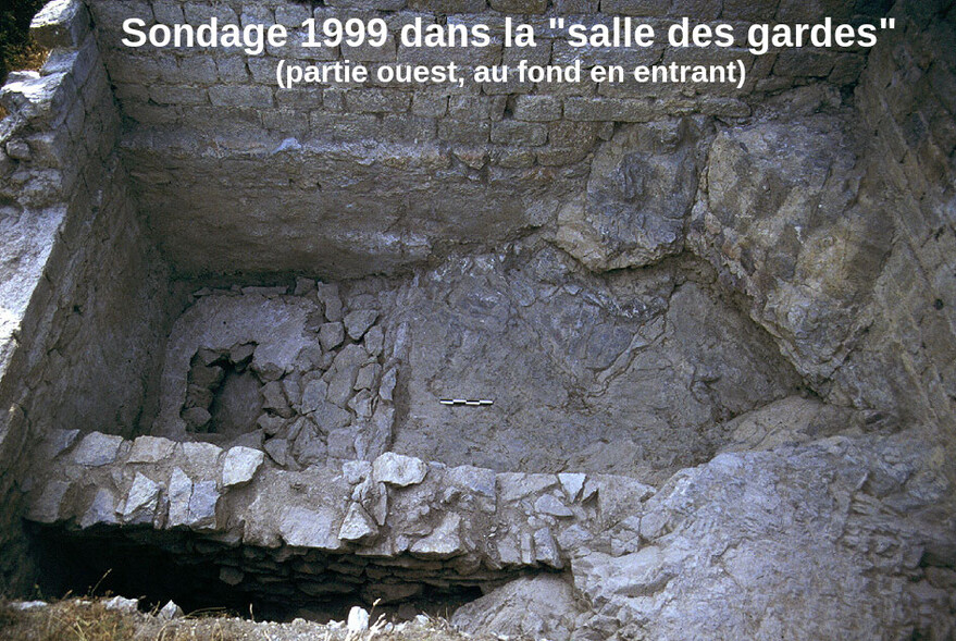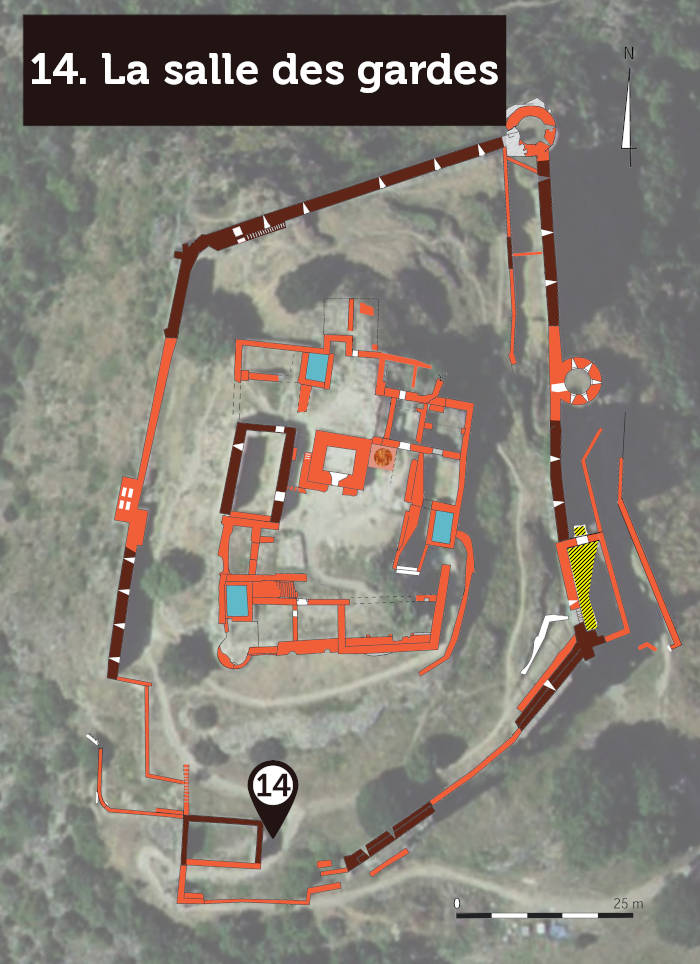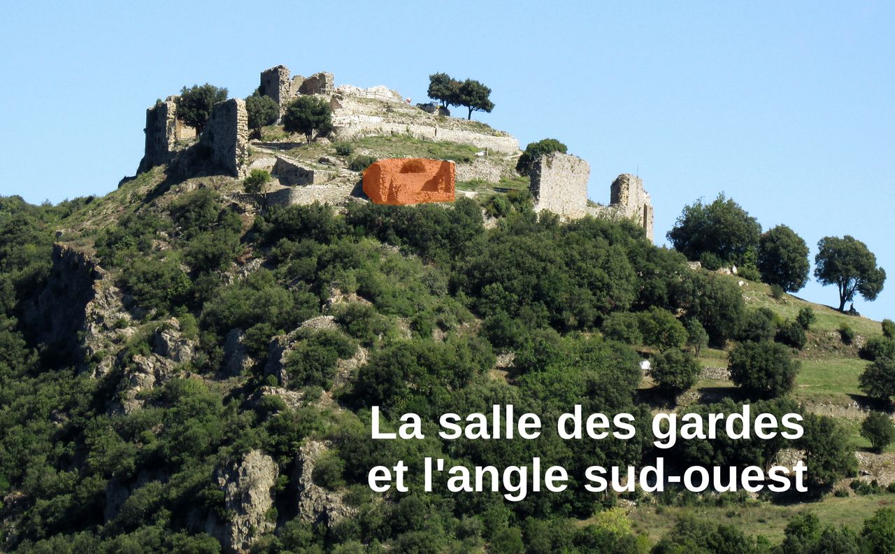 Comme vous pouvez le remarquer, le haut mur d'enceinte principal ne se retrouve pas dans ce secteur. Les éléments bâtis que sont la salle des gardes, bien identifiable, ainsi que les vestiges voisins, ont été construits à diverses époques du Moyen-âge, mais encore mal définies. Selon l'archéologue Jean-Paul CAZES toutefois, ce bâti isolé est "seigneurial" (XIIe).