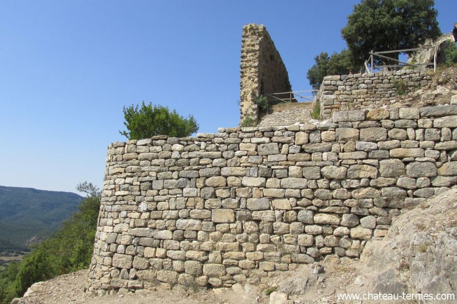 Le chantier de bénévoles "REMPART 2015" a permis la consolidation-restauration d'un angle de mur arrondi voisin de la "salle des gardes". C'est une illustration de la technique de la pierre sèche, faisant tenir un mur (et un angle !) sans mortier.