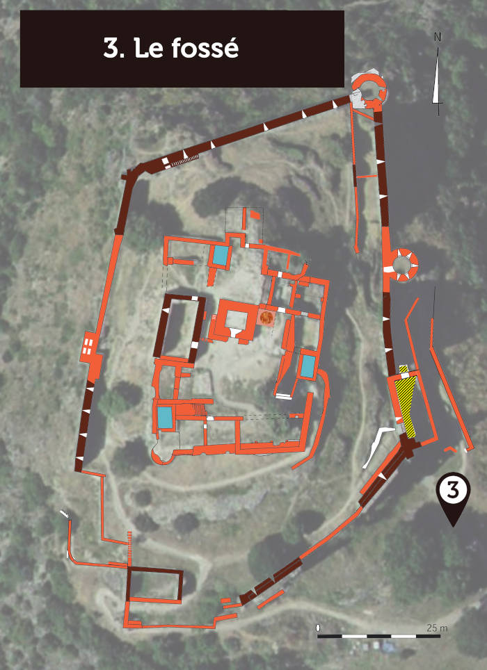 Donc un fossé sec ! Il est de nos jours encore partiellement comblé, il faut l'imaginer plus profond. C'est ce qu'à révélé un sondage en 2010 (voir photo ci-dessous).