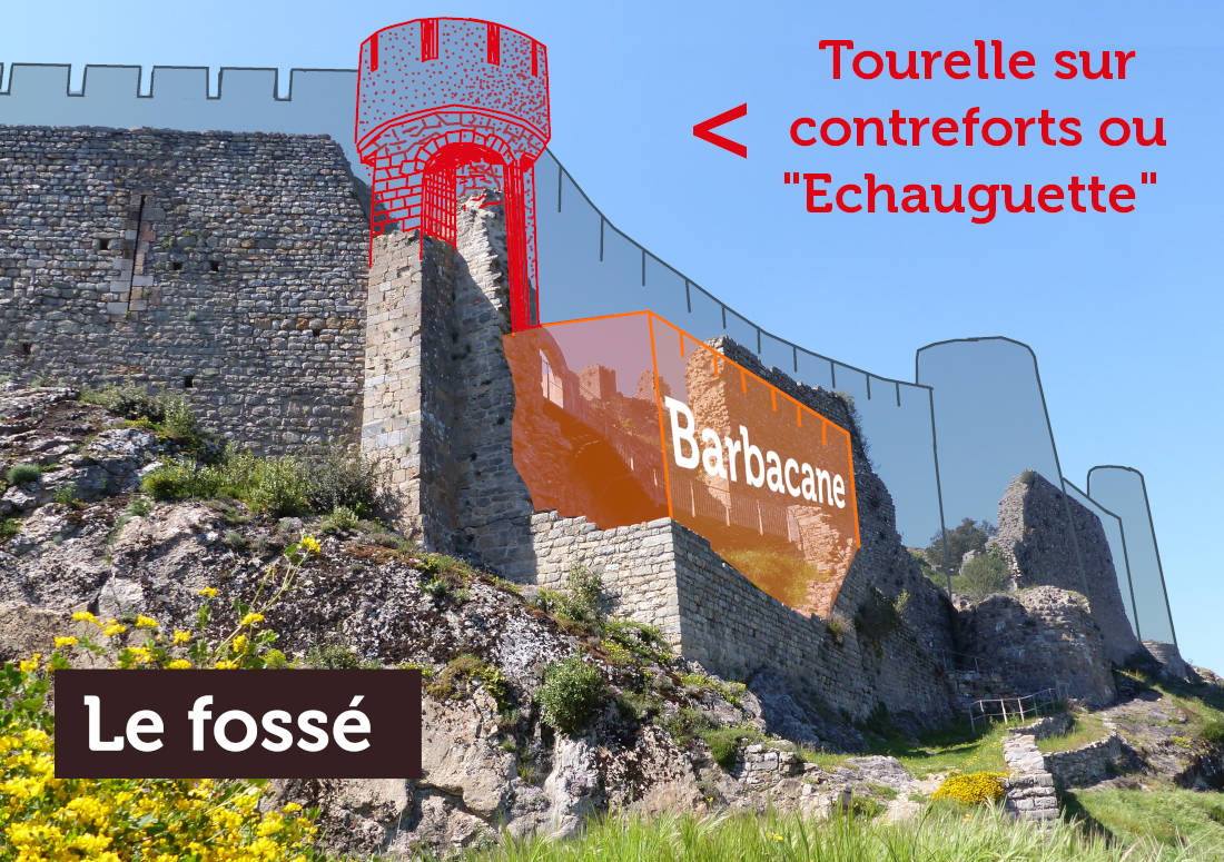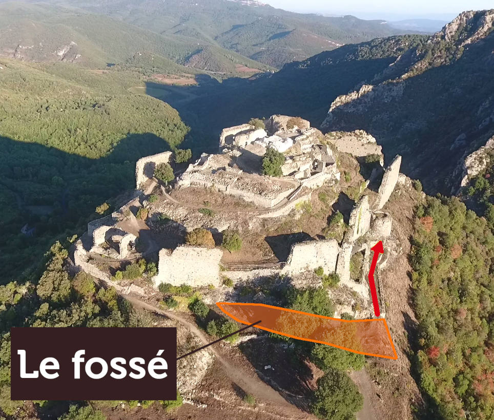 D'une part, le versant sud du château de Termes n'est pas "à ce point" pentu. D'autre part, il y avait dès l'origine ici une barre rocheuse propice à la défense... et dessous un lieu qu'il suffisait d'approfondir et élargir pour améliorer la défense.