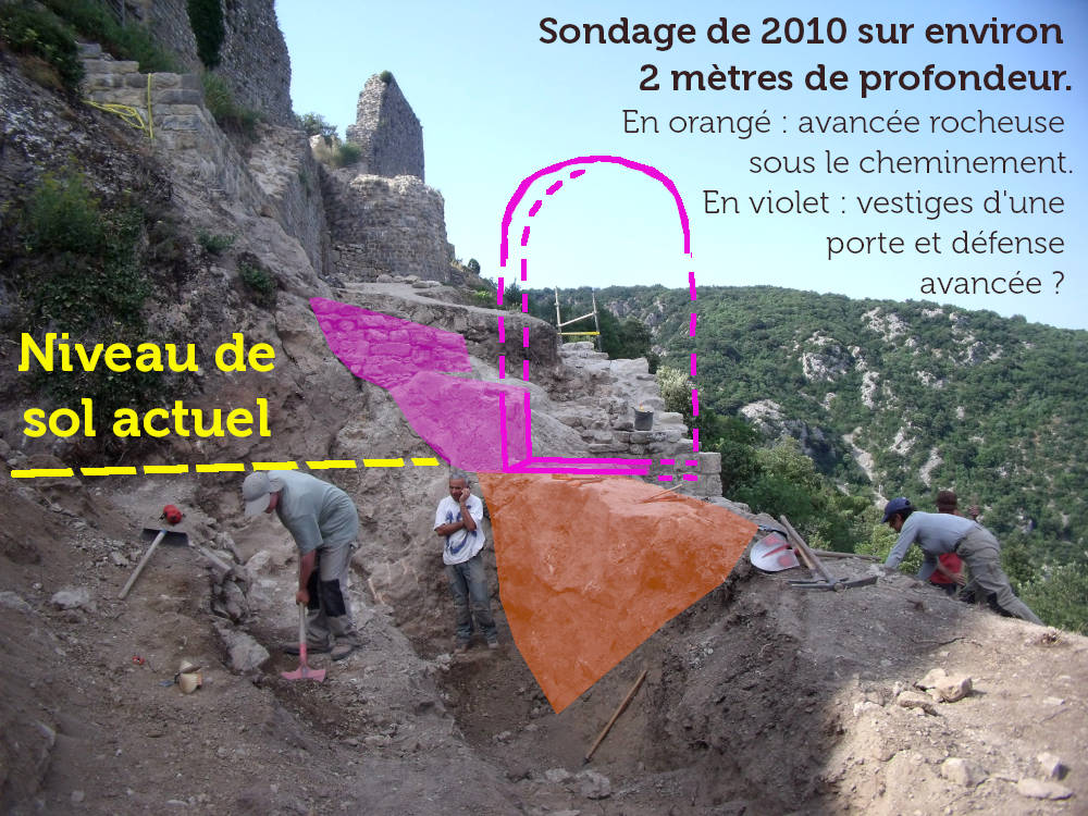 Ce sondage a au passage révélé des ajouts tardifs (XVe ?), érigés après le grand chantier royal du XIIIe siècle. Un seuil de porte est ainsi l'indice de quelques aménagements visant à gêner la progression des assaillants sur la rampe d'accès.