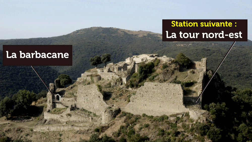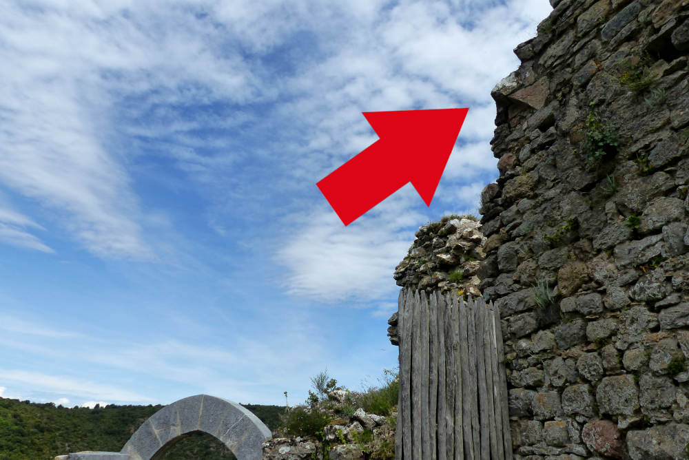 Or, face à la porte d'entrée principale (restituée), il y a surtout la vallée ! Aucun mangonneau ne pouvait donc menacer directement la porte, protégée derrière sa barbacane et une échauguette.