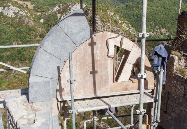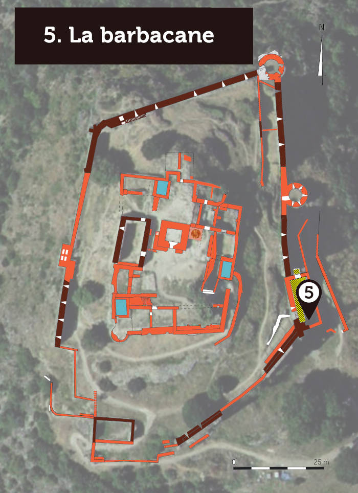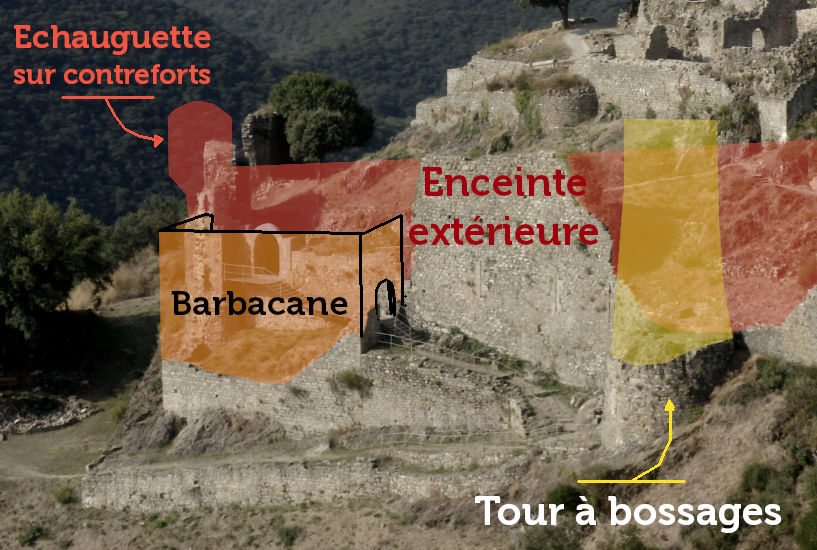Ce chantier a été l'occasion de restaurer/remonter une partie des murs de la barbacane, tout en gardant un aspect "ruine" :