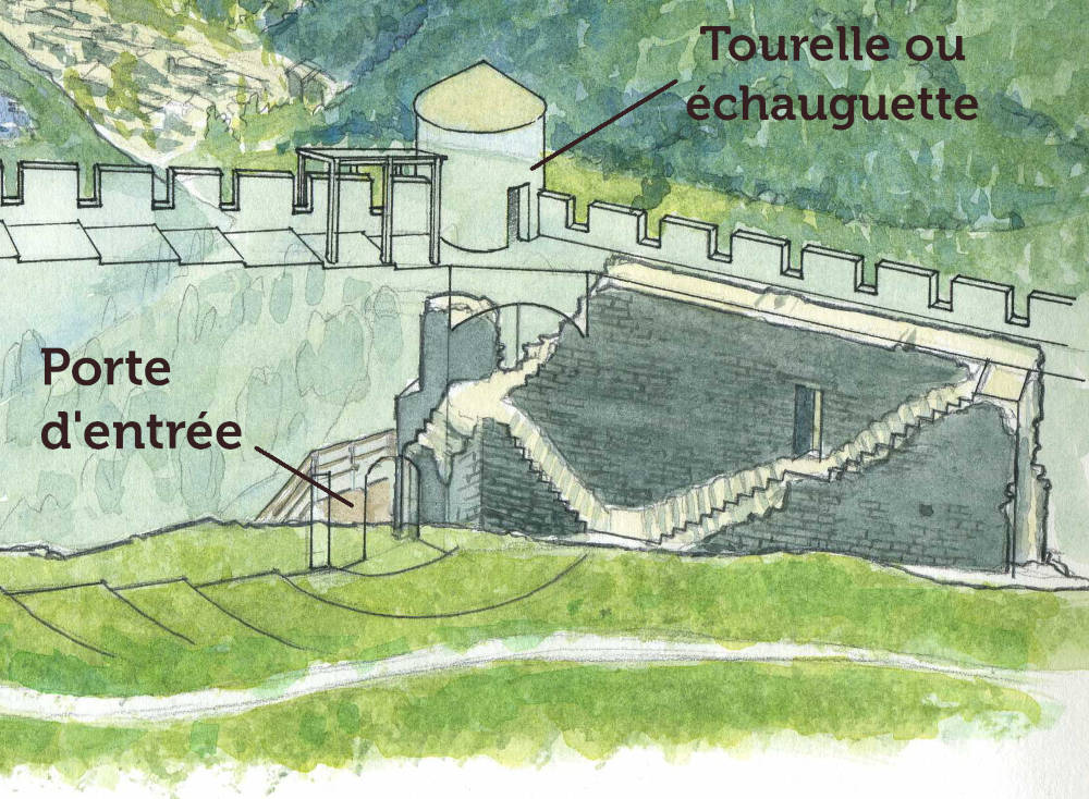 La porte principale du château a été consolidée et en partie restituée en 2013. L'arc et le montant (du coté nord, avec une base d'archère) sont donc des restaurations.