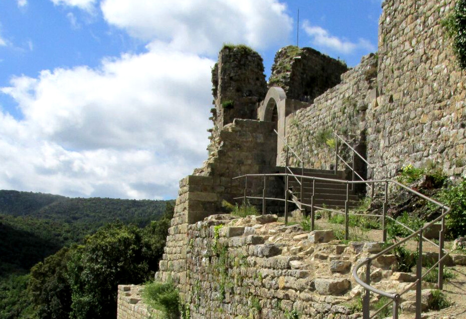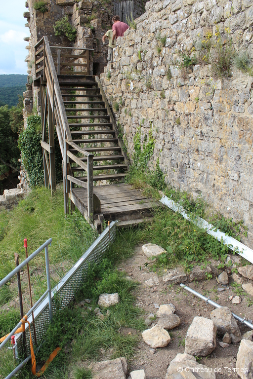 Ceci dit, les chantiers des années 1990 ont déjà déblayé ici une calade, et il faut remarquer sur la gauche les escaliers qui permettaient d'accèder au chemin de ronde.