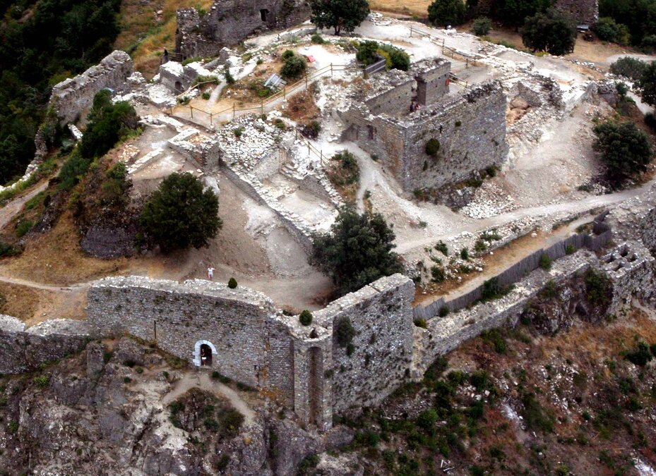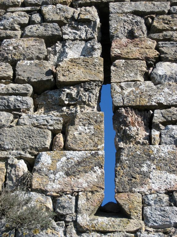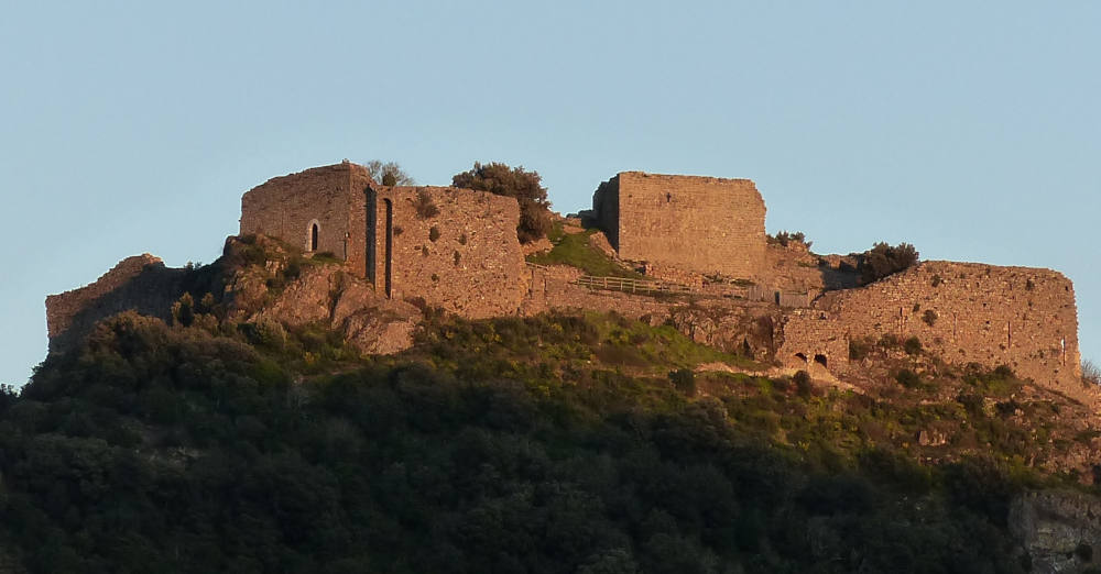 Vous longez ici le flanc ouest du château, qui domine la vallée de Caulière. Les collines ou montagnes qui s'offrent à vos yeux par temps clair sonnent aux noms de "Peyre Fouillère", "Pic Berlès", "Milobre de Bouisse"...